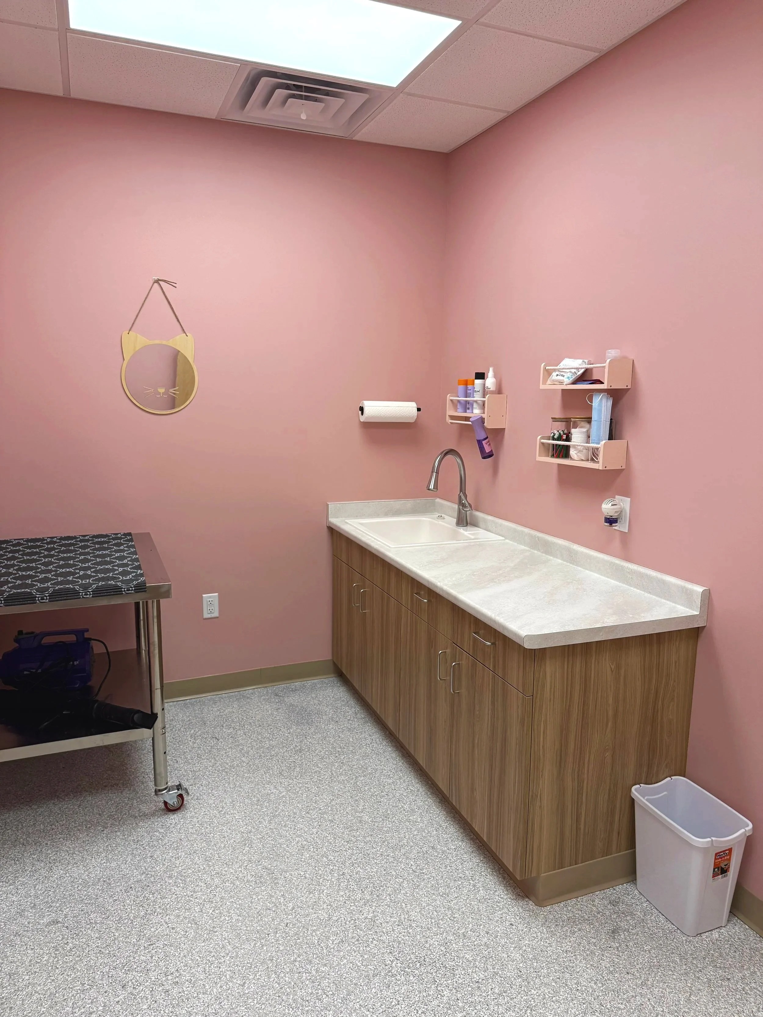 no-dogs allowed cat grooming studio w/cat bath, cat dryers, cat bathing products, cat calming tools, restraints and techniques.